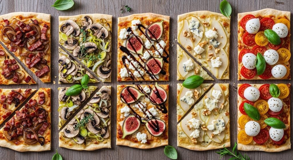 When it comes to Flammkuchen (German Flatbread Pizza), the classic bacon and onion topping is just the beginning. One popular twist is Gratinée Gruyère cheese added, which brings a nutty richness, or even Munster Muenster cheese for a stronger flavor. If you enjoy earthy notes, try Forestière mushrooms or a simple mix of leeks mushrooms over the creamy base. For a lighter option, go vegetarian grilled vegetables shredded cheese, or balance sweetness and salt with roasted butternut squash red onion feta. I’ve also tested combinations like figs red onion goat cheese and pear gorgonzola, both of which work beautifully on the thin crust without overpowering it.
