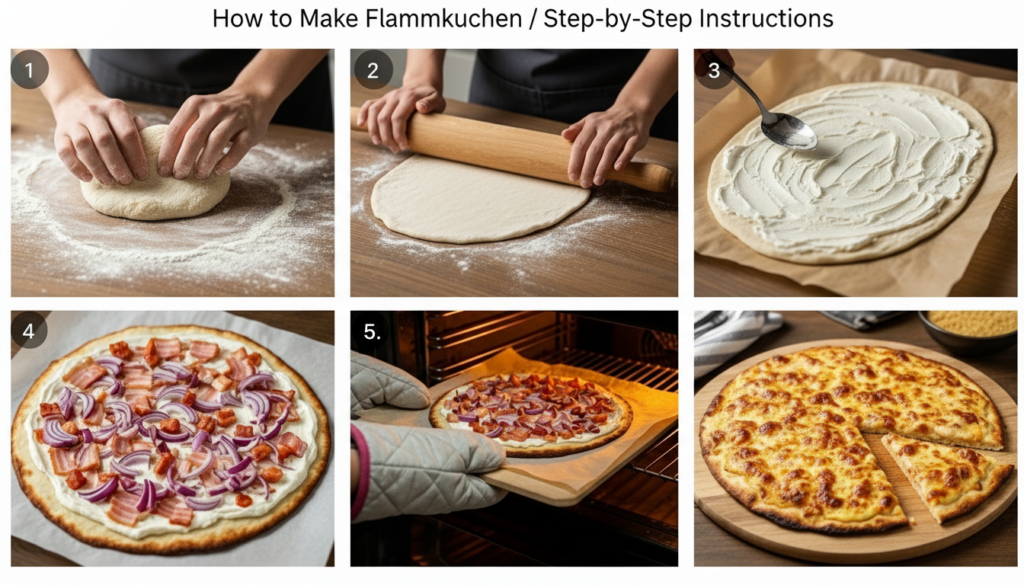 The classic Alsatian version includes crème fraîche, thinly sliced raw onions, and bacon (Speck or lardons). These are traditionally added raw before baking.