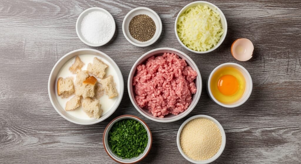 For authentic Kotlety Mielone, I always begin with Ground pork shoulder Łopatka Karkówka pork chuck, using either 1 lb ground pork 450g, 1.1-1.2 pound 500-550 g, or 1.1 pounds 500 g approx 7% fat 7-10% fat sufficient for the right balance. Some cooks prefer a pork beef veal mix turkey healthier choice, but the texture changes slightly. Buying from trusted sources butcher minced at home supermarket mince difference notable mustard dollop flavour truly makes a difference in taste. To keep the patties tender, I add stale bread soaked in milk small stale dinner roll 2 slices white stale bread ½ large bread roll 1 small 1.4 oz 40 g with 1/2 cup milk 120ml ½ cup 120 ml milk stock water. For structure, use breadcrumbs regular finely ground not panko extra coating 1/4 cup ½ cup 50 g 3-4 tablespoons.