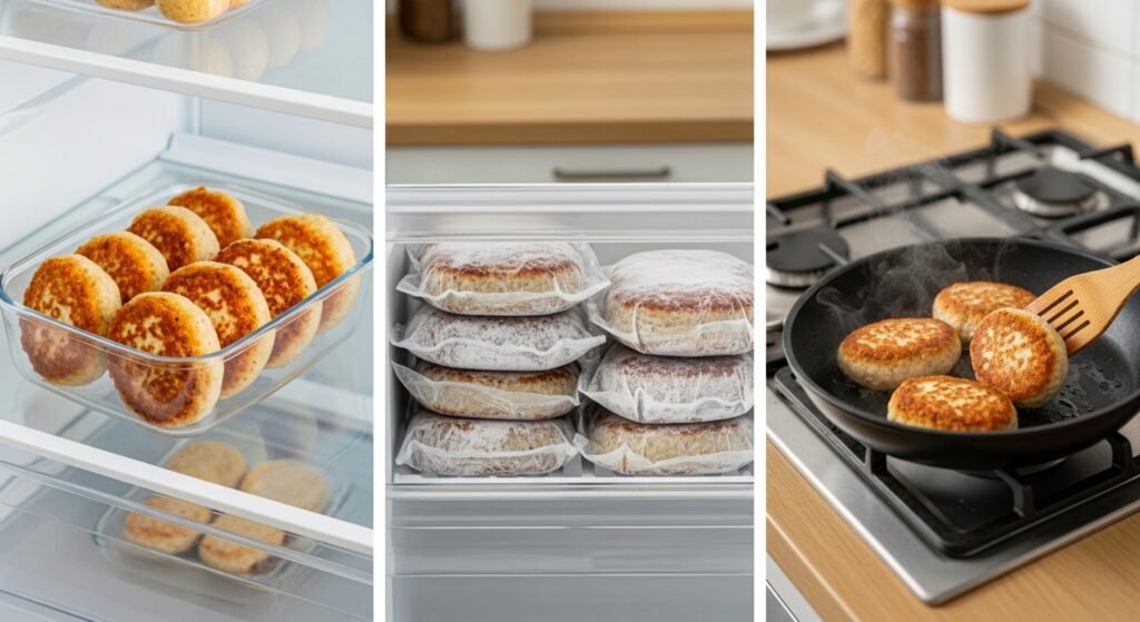 When it comes to leftovers, these patties Reheat very well best freshly made next day more dense less fluffy crispy, so I usually enjoy them right after cooking. To keep them safe, store fridge 3 days 3-4 days tightly closed container container lid covered refrigerated so they stay moist. For warming up, you can reheat cold oven 320°F 160°C 10-15 minutes oven 350°F 180°C 12-18 minutes stove butter canola oil low heat water lid microwave paper towels loosely cover, depending on how much time you have and whether you want them slightly crisp again.